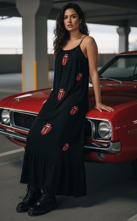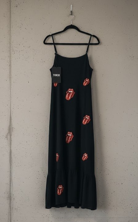 Este no es un simple vestido negro. Es una declaración de intenciones. Confeccionado en poplín que ofrece una textura suave y un vuelo envidiable, su silueta amplia y desestructurada te da ese aire despreocupado y cool. El toque de leyenda lo ponen las lenguas de los Stones: un bordado vibrante de lentejuelas que capta todas las miradas. Llévalo con botas, zapatillas, ¡o lo que sea que dicte tu rock!